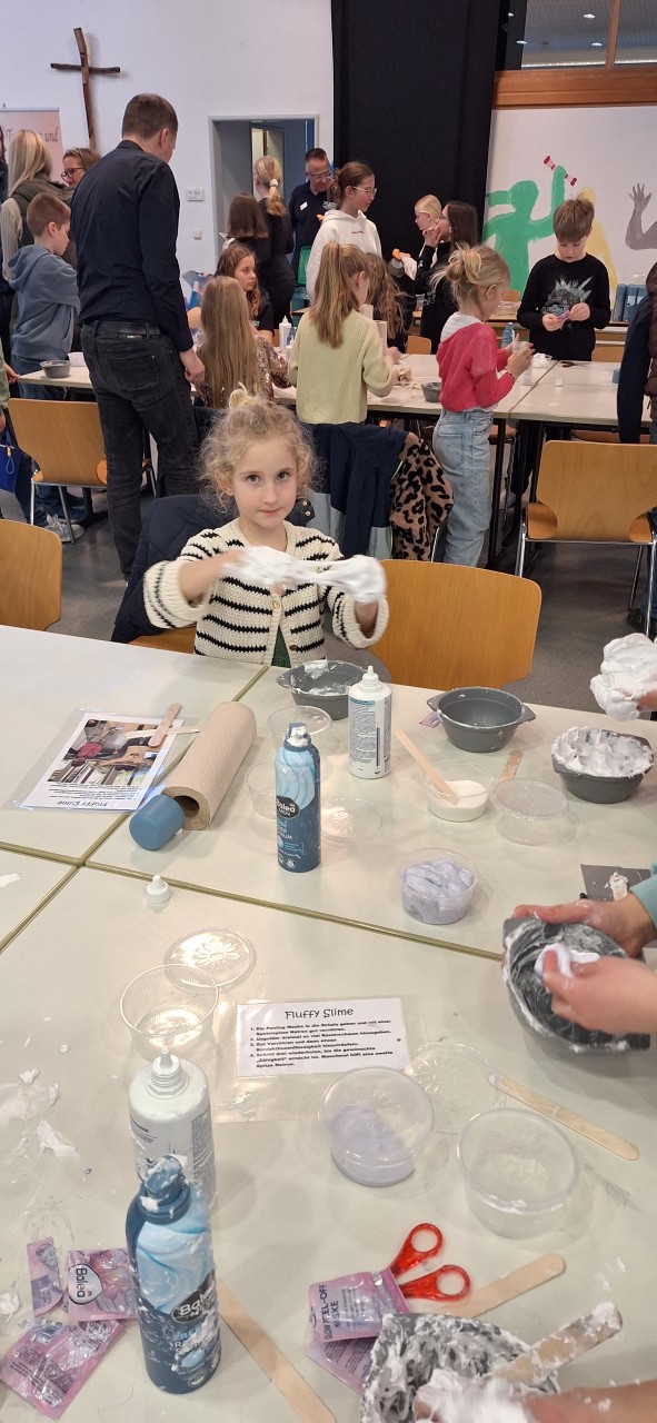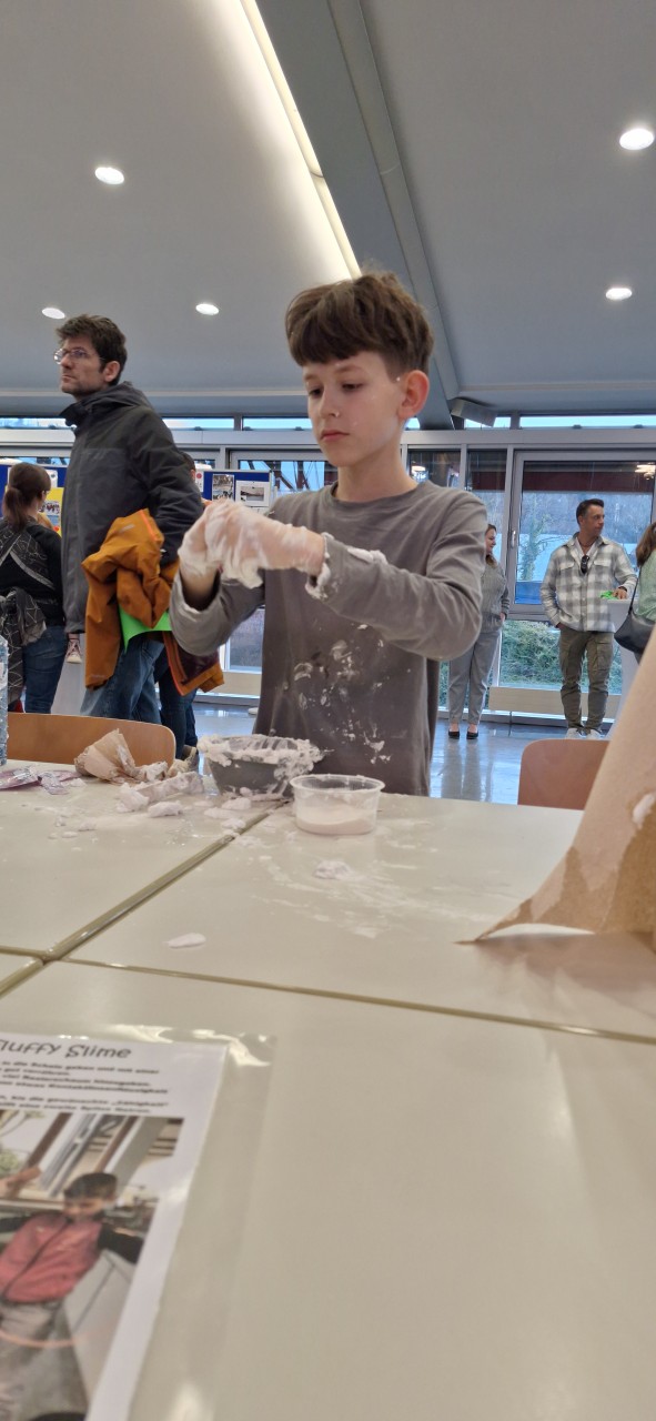 „Vorsicht, Schwerverletzter!“, riefen auf einmal die Schulsanitäter und eilten mit ihrer Trage und einer lebensbedrohlich verletzten Person aus dem Lehrerzimmer durch die Gänge. Sie stellten ihr Wahlfach vor, das sich seit Jahren großer Beliebtheit erfreut. Ebenfalls sehr begehrt ist die Forscherklasse, die im Physiksaal Glitzerschleim in allen Farben herstellte.