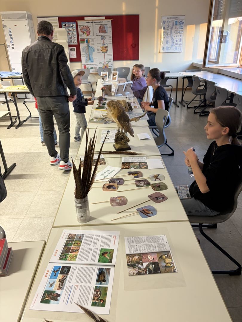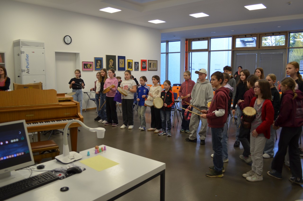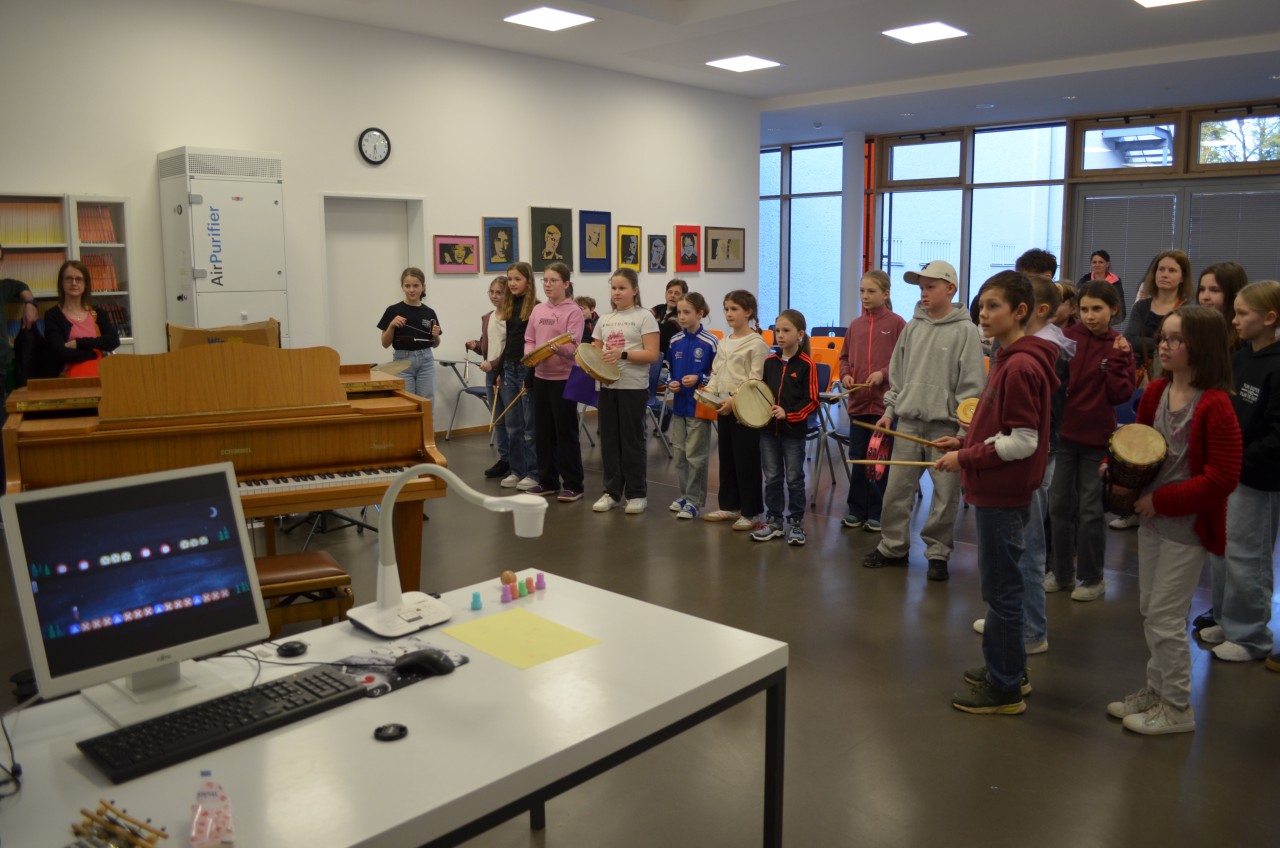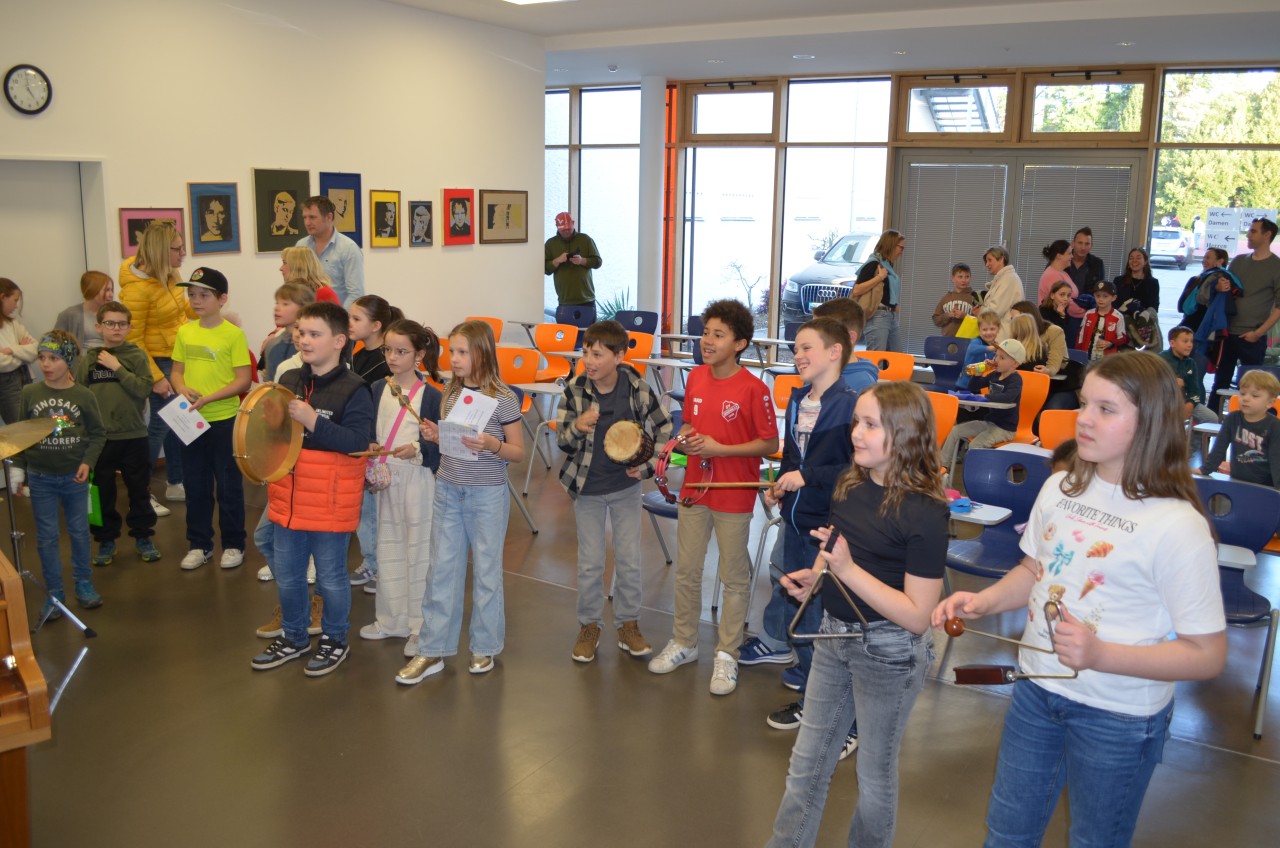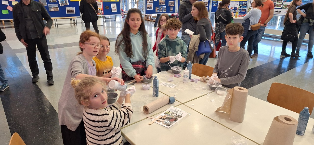 Diesem besonderen Nachmittag ging eine intensive Vorarbeit voraus, welche ein Team aus Lehrern und Schülern geleistet hatte. So entstand ein abwechslungsreicher Rundgang, der durch das gesamte von Stephi Knab und ihren Klassen österlich geschmückte Schulhaus führte. Dieses konnte man auf eigene Faust oder in geführten Gruppen erkunden. Schüler der Musikklasse 5b sorgten mit Percussion-Instrumenten für rhythmischen Schwung und rührten damit bestens die Werbetrommel für die kommende Musikklasse. Bei jeder (Mitmach-) Station gab es einen Stempel in die Laufkarte. Auch Bastel- und Werkfreunde kamen in Kunst und Geschichte mit römischem Basteln auf ihre Kosten. Richtig „goldig“ gingen die jungen Chemiker ans Werk, denn in diesem Labor wurden Münzen zu echten Goldschätzen verwandelt. „Entdecken!“, hieß es im Biologiesaal. Hier wurden die Viertklässler mit dem Mikroskopieren bekannt gemacht.